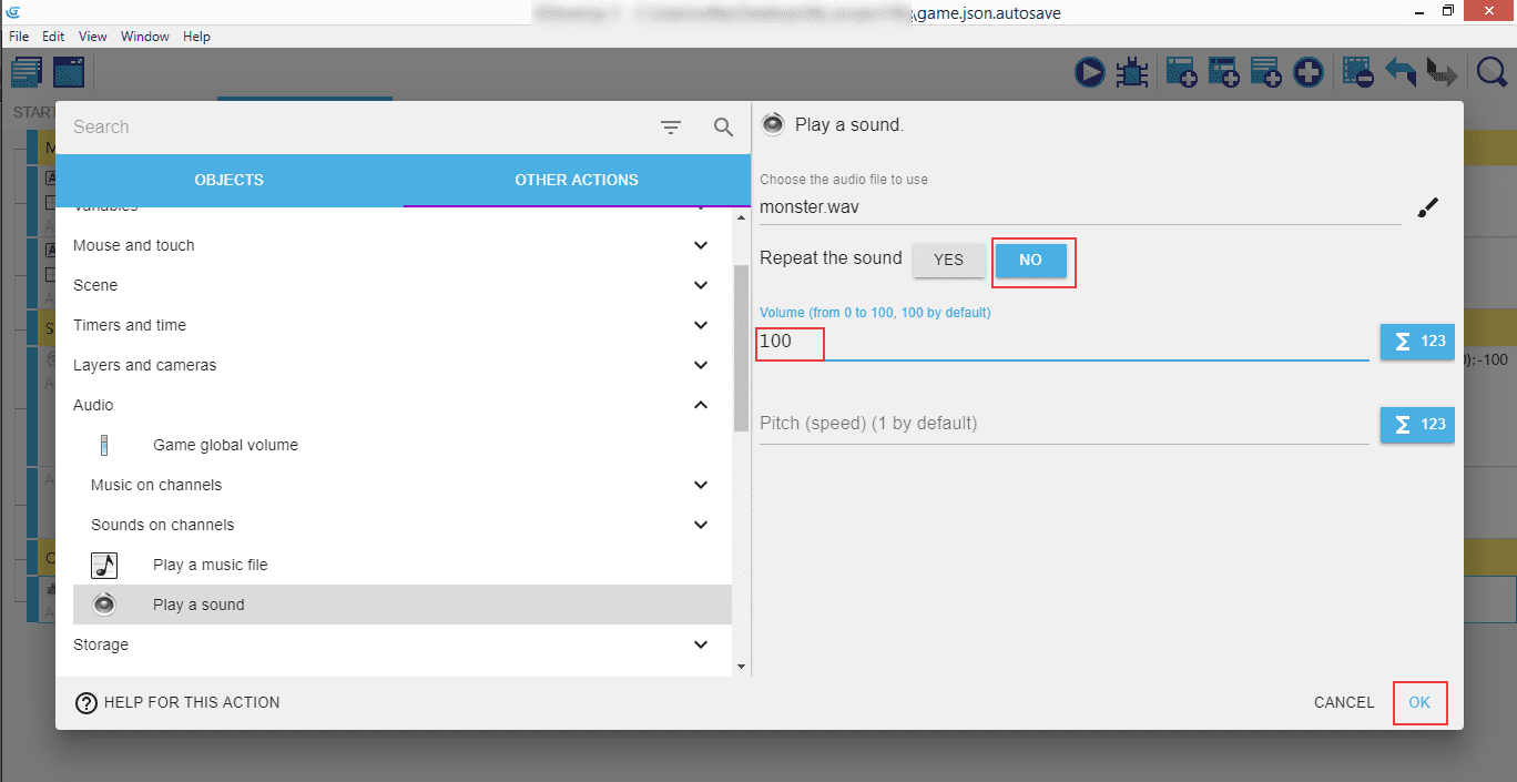Make sure the "Repeat the sound" is set to "No" as we want this to be played only once when the Monster collects the shape. The default volume is 100.