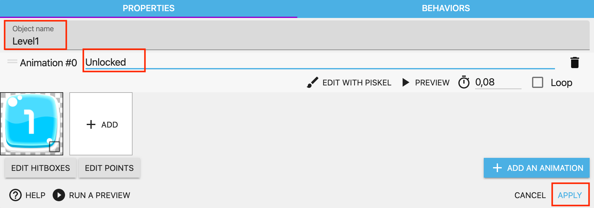 Add a new object called Level2 select the image button_locked.png from the assets folder. Set the animation name to "Locked". To create a new animation, select the image button_level_2.png, and use "Unlocked" in the name field.